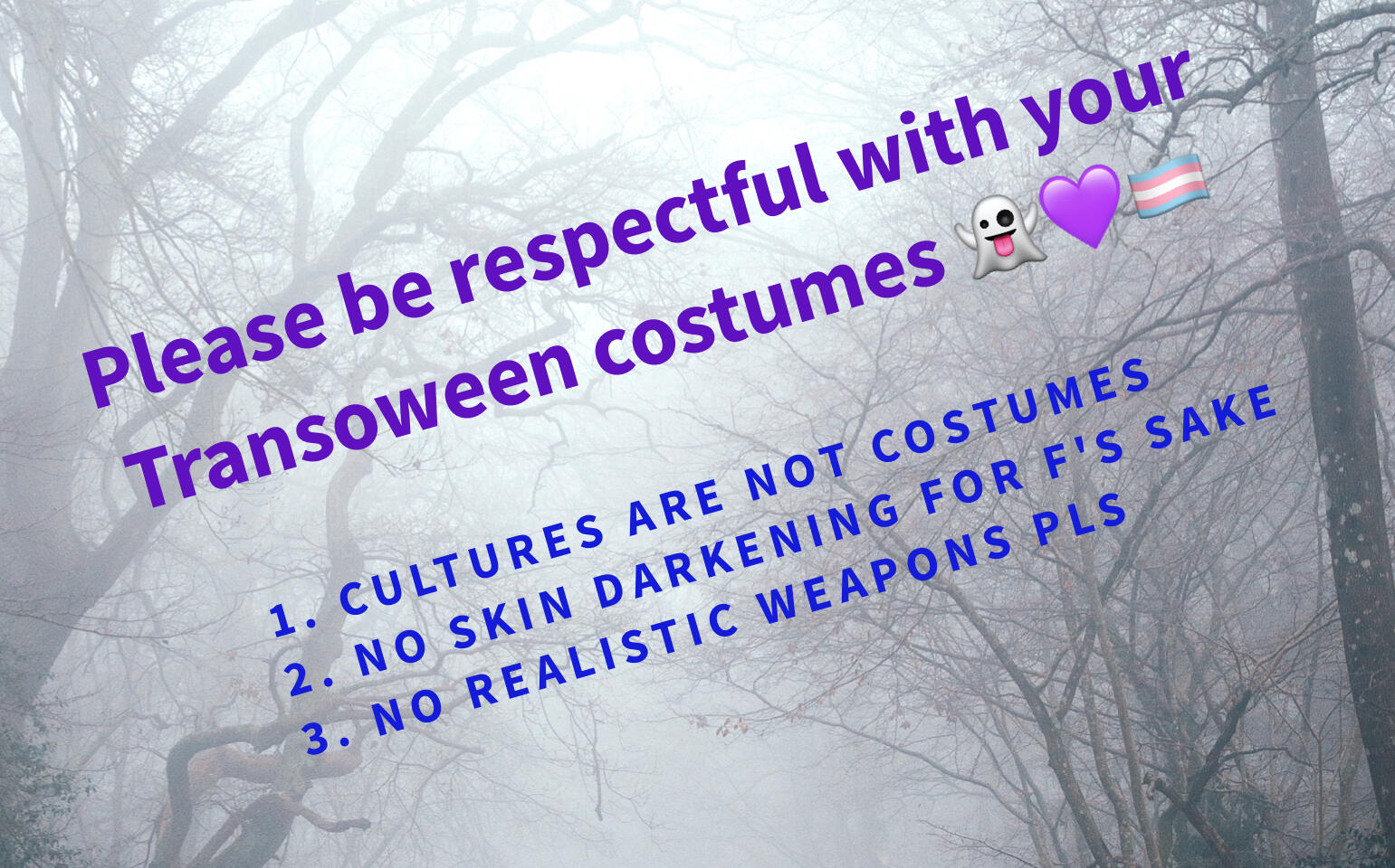 WHAT TO BRING: Your awesome self, a genderful (or genderless) costume -- optional but recommended, and if you want, bring activities, treats, candy, games, or anything else to share and connect with community. We'll also have a "transoween flair share" where you can share old unused/unwanted costume accessories.